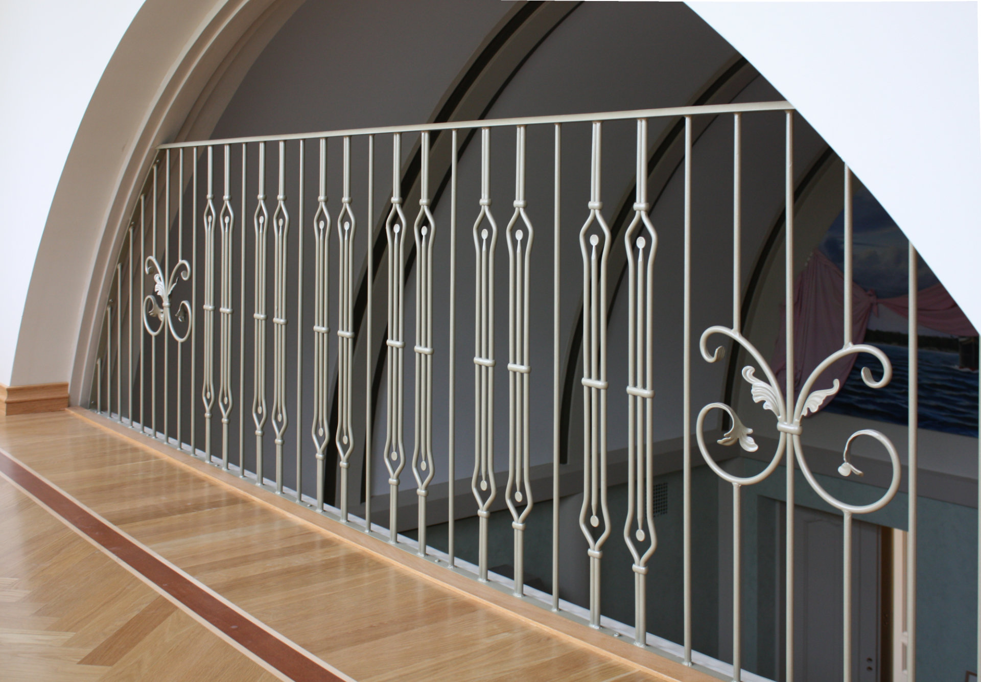 Tämä vaalea beigen värinen kaide on suunniteltu ja valmistettu Laupusten kartanoon yläkerran aulaan.