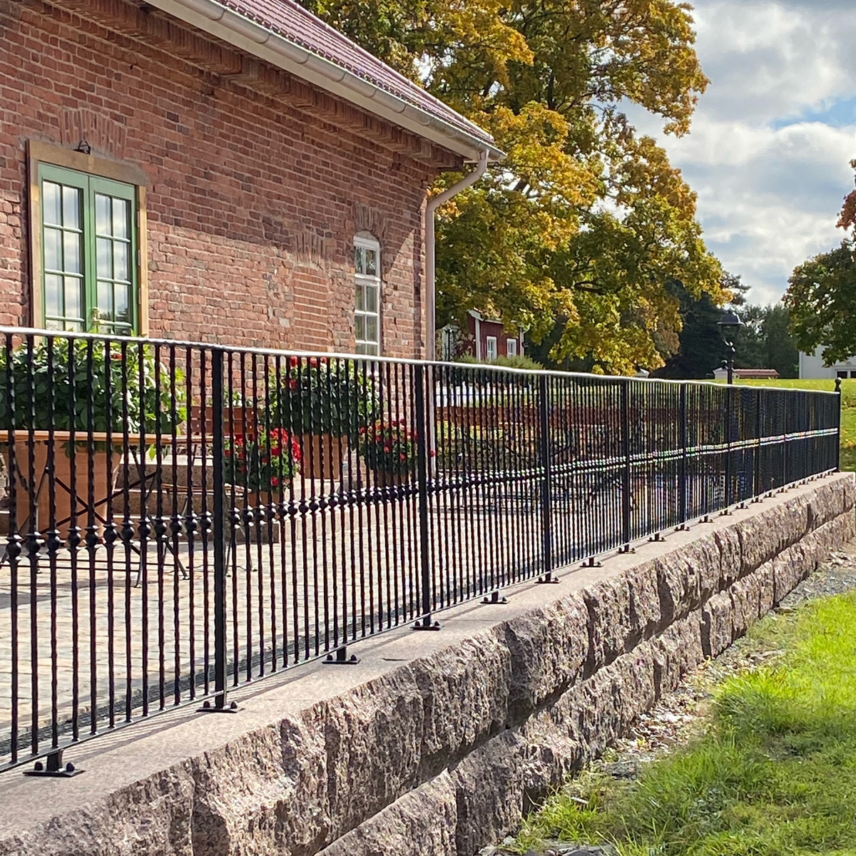 Kuvan kaide on valmistettu mittatilauksena Söderlångvikin kartanolle. Pintakäsittelynä kaiteessa on sinkkimaali ja sen päällä laadukas mattamusta pulverimaali. Näin kaiteesta saadaan hyvinkin pitkäikäinen ja huoltovapaa.