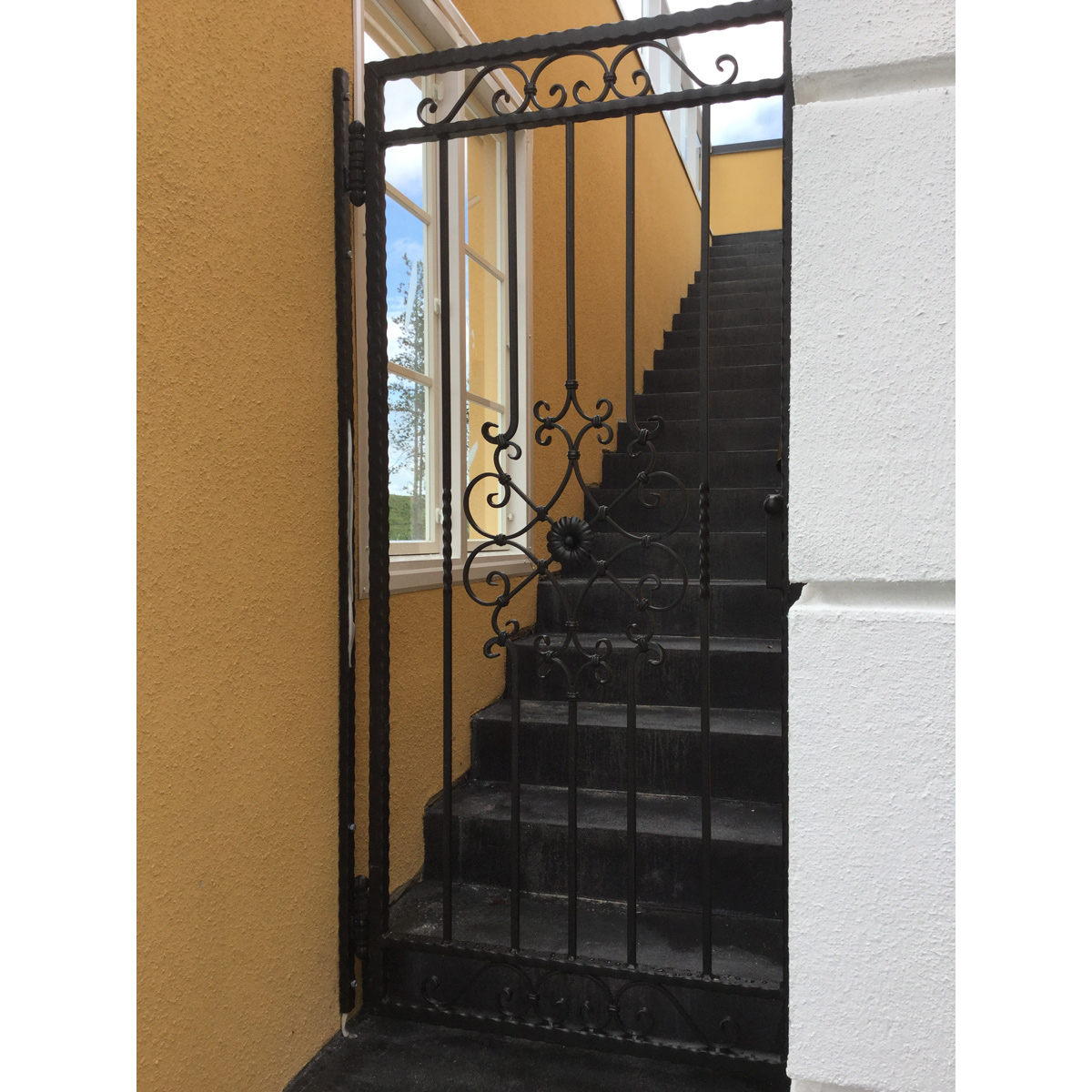 Kuvan musta takorautaportti on valmistettu mittatilauksena Seinäjoen asuntomessuille kohteeseen Villa Tango. Portti on kuumasinkitty ja maalattu pulverimaalilla mattamustaksi. Valmistimme samaan kohteeseen myös seuraavat tuotteet:
