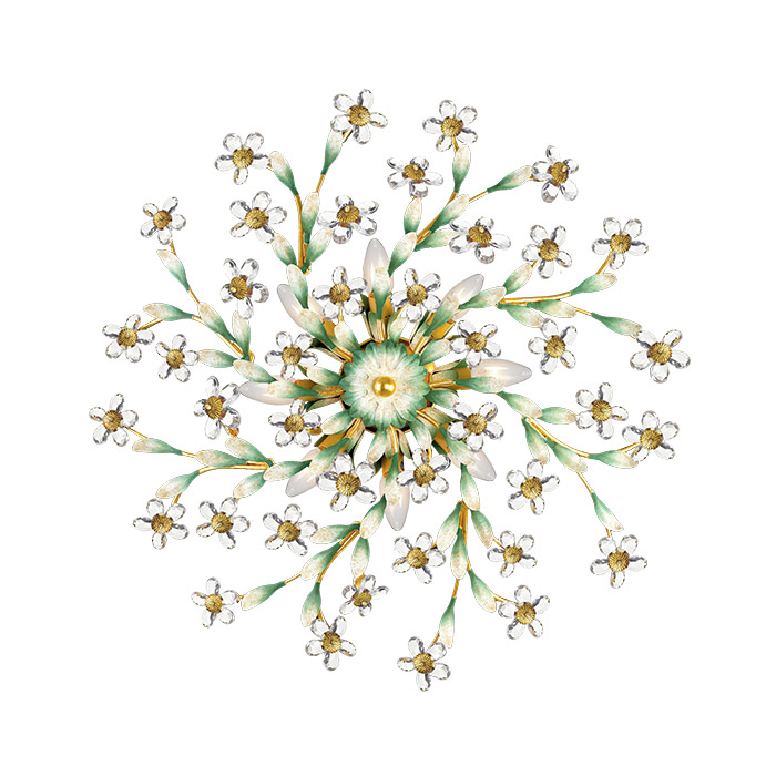 Plafondissa on 8 lamppua ja kunkin lampun kohdalta lähtee köynnös, jossa on kristalleista muodostetut kukat ja metallilehdet.