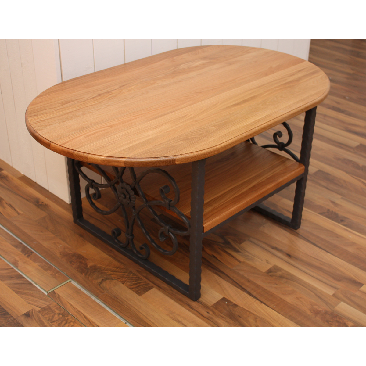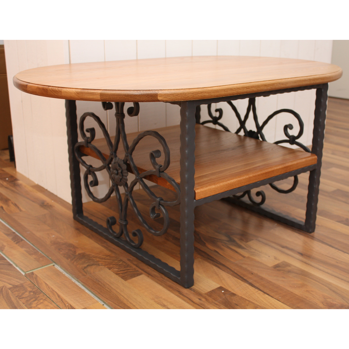 Kuvan harmaaksi maalattu sohvapöytä on valmistettu asiakkaalle mittojen mukaan takorautarungolla ja lakatulla tammitasolla.